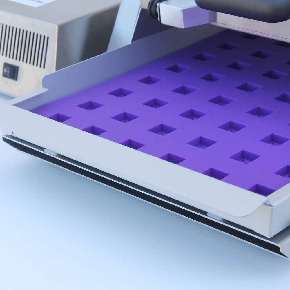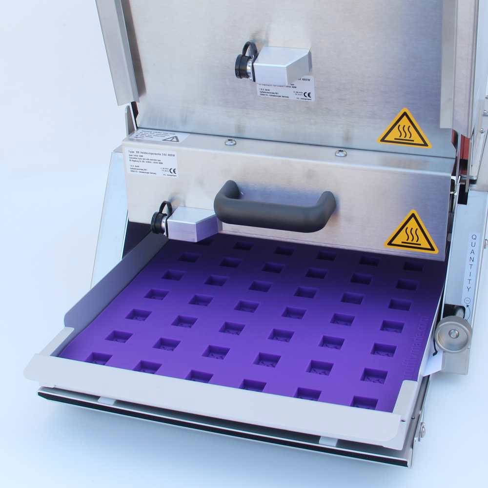 This Universal Candy Depositor for gummies and hard candies is designed to work with all the Truffly Made silicone molds and most polycarbonate molds up to 11.5 inches wide, it delivers accurately metered fillings with great flexibility. Stainless steel construction with adjustable depositing nozzles that can be easily positioned to each mold layout. The Universal Candy Depositor comes with the hopper with heated panels.