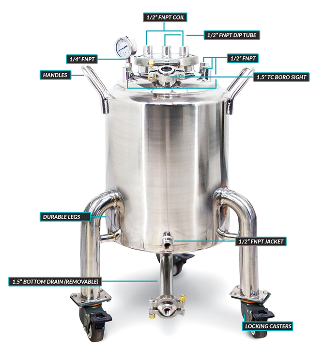 USA Lab 50LB Jacketed Solvent Tank w/ Sight Glasses, Casters, & 1.5″ TC Drain (50LB Water, 24LB Butane)